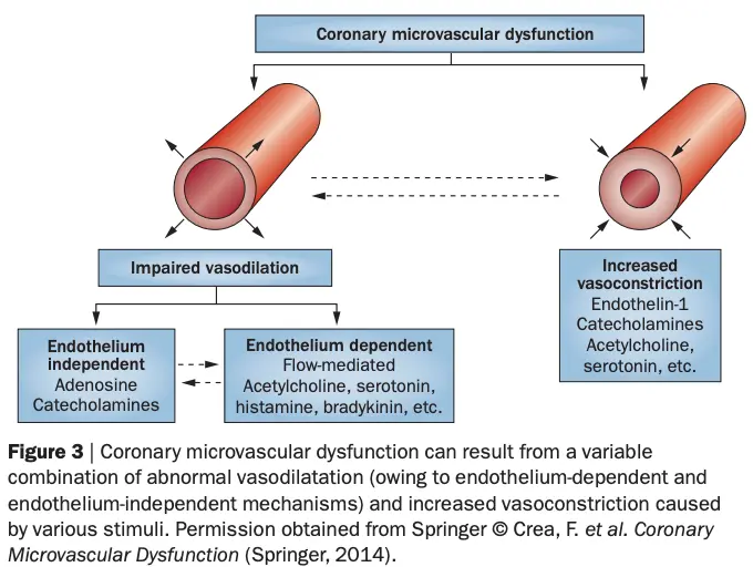 - impaired dilation (vasodilator abnormalities) and/or an ↑ constriction of coronary microvessels (microvascular spasm)