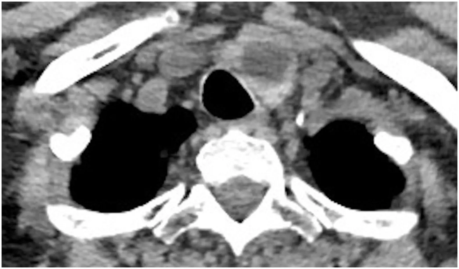 The thyroid gland is unremarkable. The chest wall is unremarkable. There is no significant adenopathy noted in the axillae, mediastinum, and hila. Lung windows reveal no acute abnormalities. Patent airways. There is no pleural effusion.
