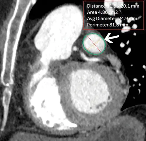 Caption: En-face-view CT image shows the cross-sectional view of the landing zone (arrow), where the maximum diameter, minimum diameter, and perimeter are measured.