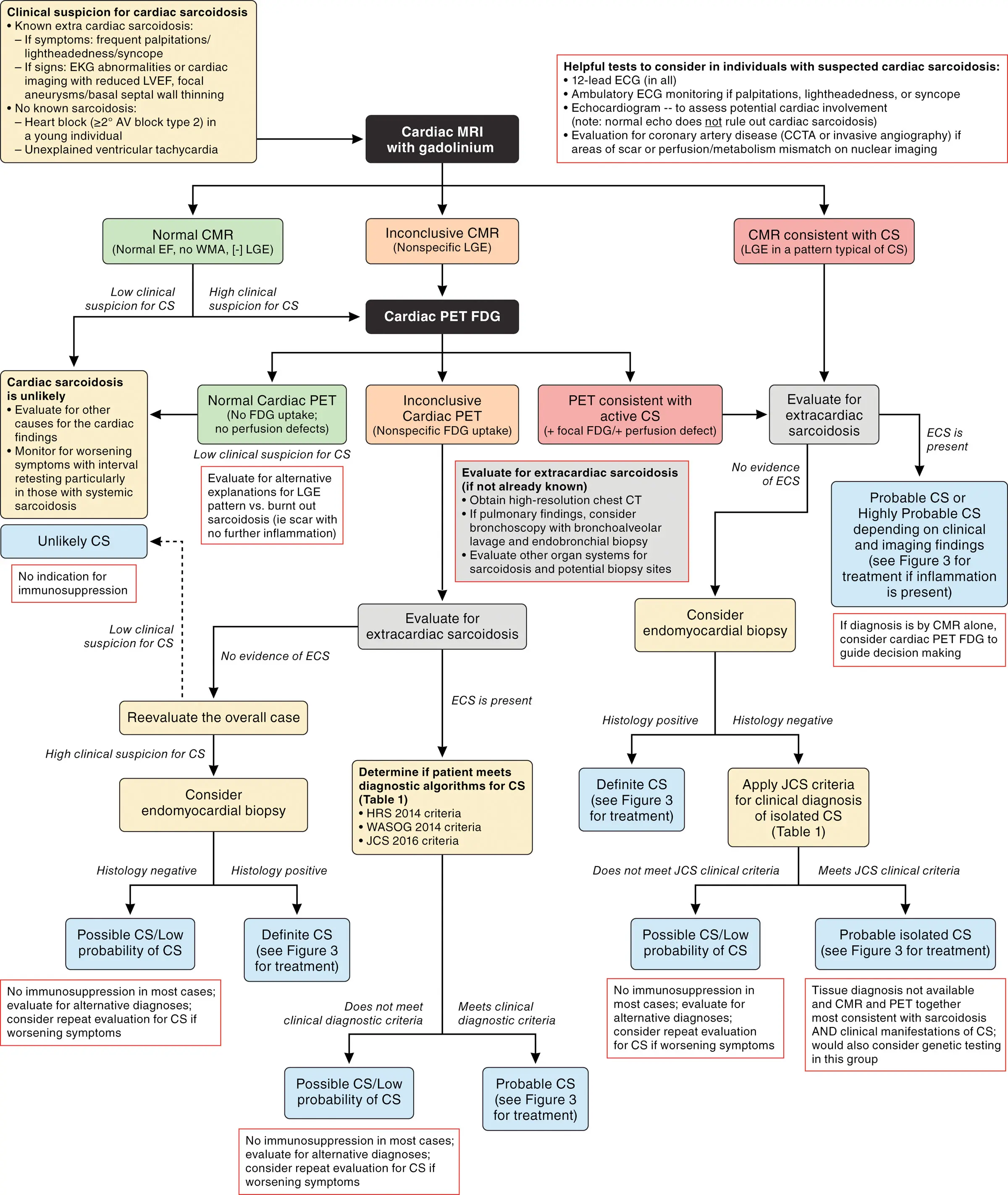 CMR has a high NPV, so obtain CMR only in low clinical suspicion. Obtain CMR and PET when high clinical suspicion