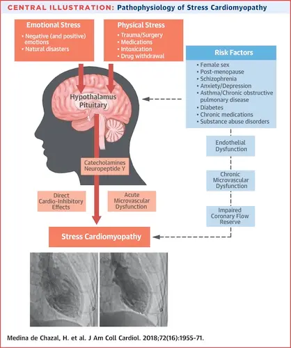 Medina de Chazal, H., Del Buono, M. G., Keyser-Marcus, L., Ma, L., Moeller, F. G., Berrocal, D., & Abbate, A. (2018). Stress Cardiomyopathy Diagnosis and Treatment. Journal of the American College of Cardiology, 72(16), 1955–1971. https://doi.org/10.1016/j.jacc.2018.07.072 ↩