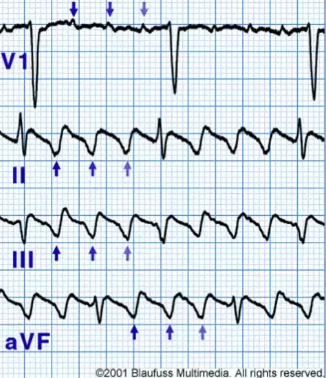 - On the ECG, you will classically observe a saw-tooth shaped P wave, negative in leads II, Ill, and aVF, which indicates the retrograde conduction up the atrial septum, consistent with counter-clockwise (“typical”) flutter.
