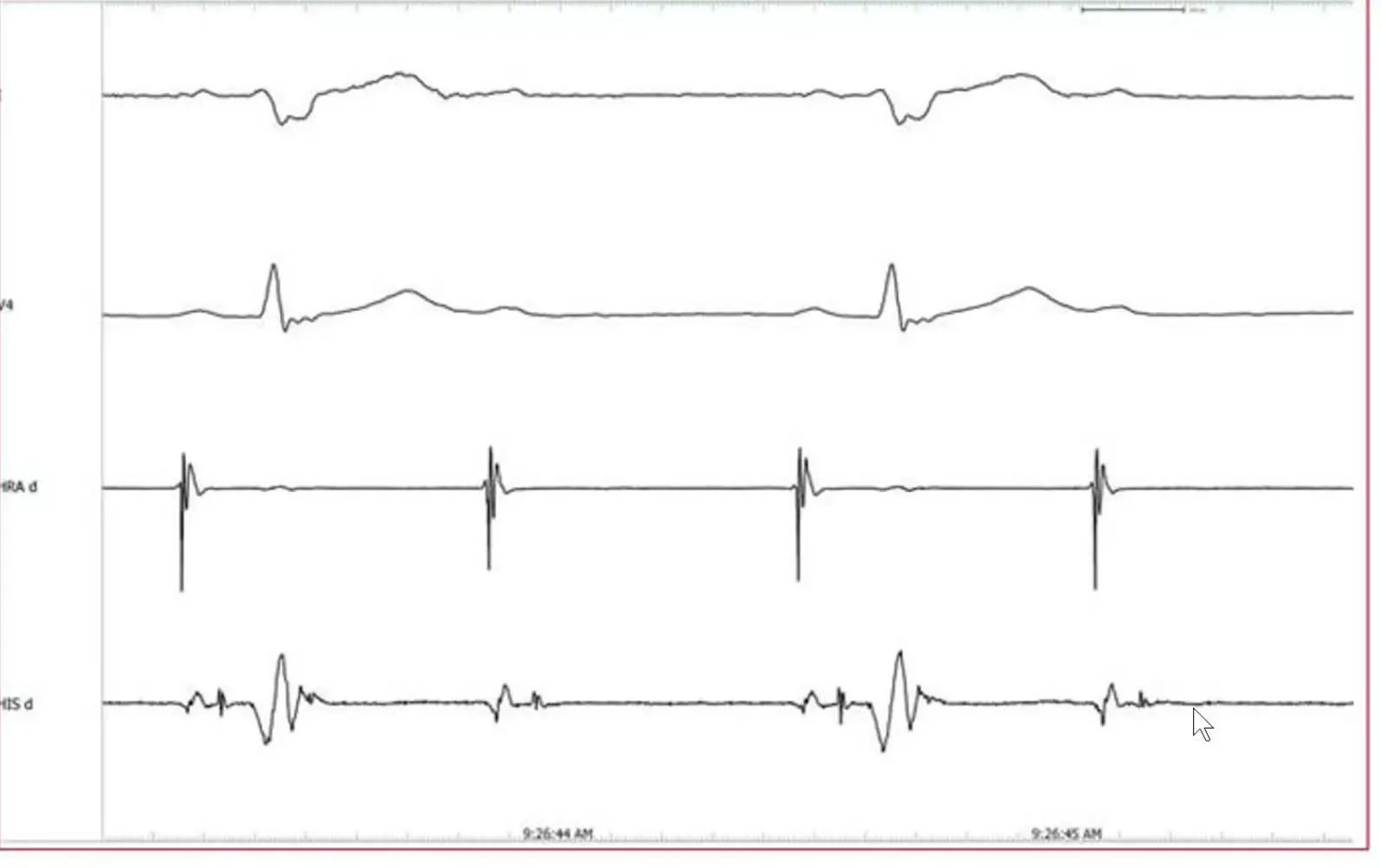 HBE - you see the A without an H after, so this is AV nodal block, i.e. above the His. The example here is Mobitz Type 1.