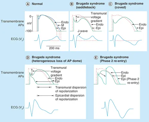 - “coved” ST-segment elevation with T-wave inversion in the right precordial leads