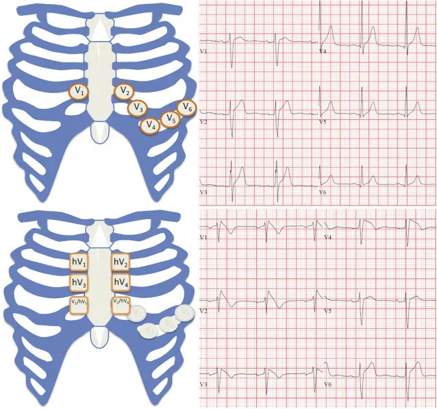 Brugada 2/3 → Type 1 with high precordial V1, V2 leads (1st, 2nd intercostal spaces) from typical 4th intercostal space