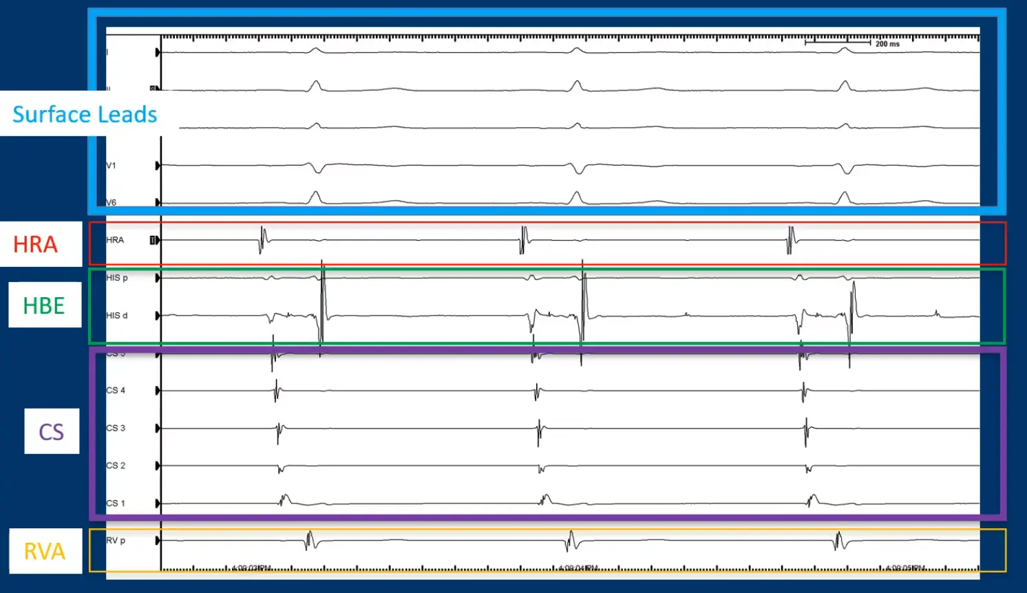 - Notice how the surface lead QRS is before the V on HBE. We use the surface V (QRS) to measure H-V interval, and not the local V (which tends to be after the surface V)
