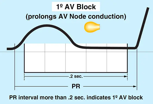 - All atrial impulses are transmitted to the ventricles, but the conduction times are prolonged → ↑ PR interval