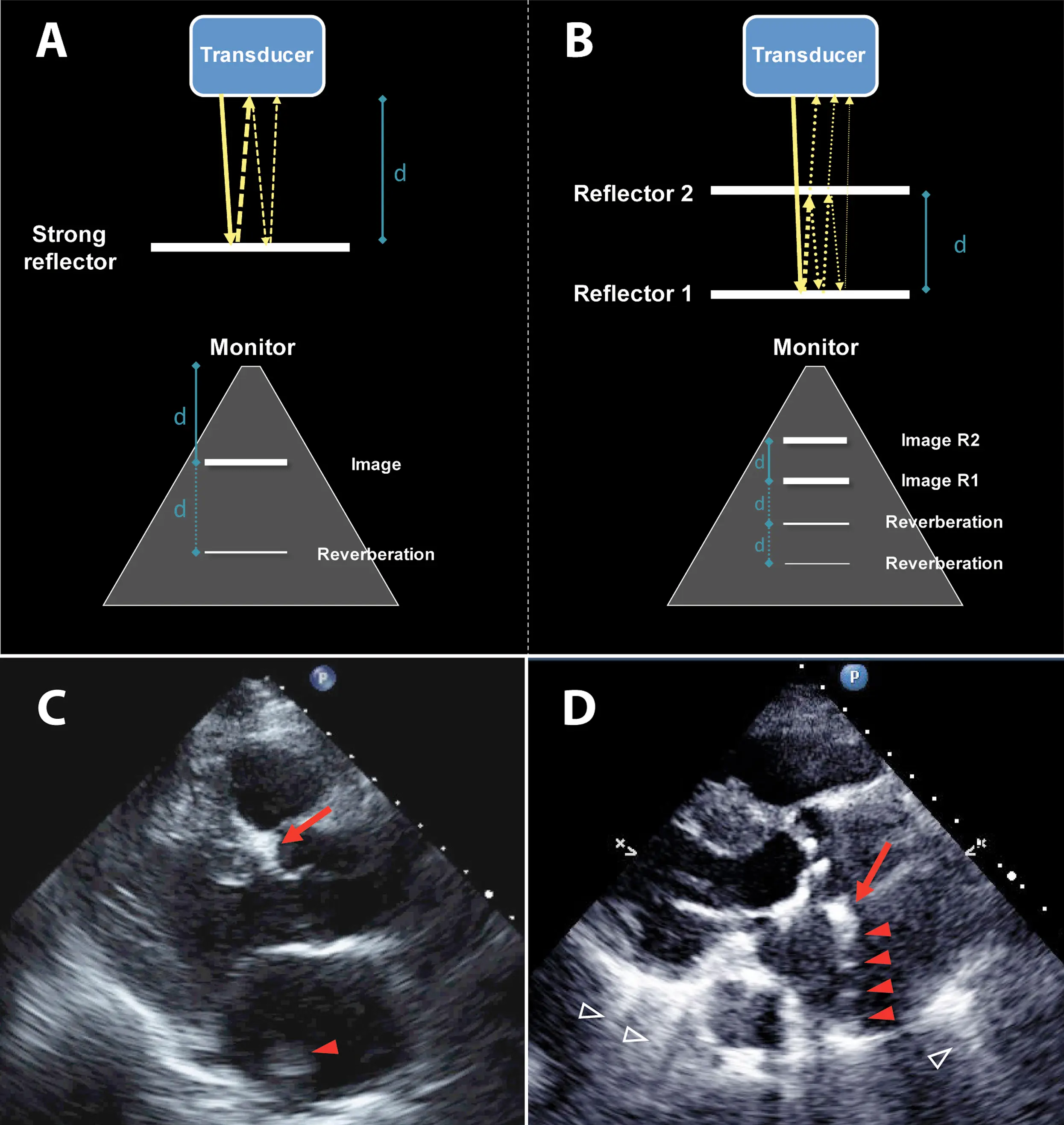 - caused by the ultrasound wave bouncing repeatedly between two strong reflectors, creating multiple, equally spaced, hyperechoic lines that can obscure the true anatomy
