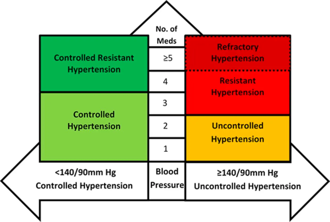 - “Refractory hypertension is currently defined as the failure of office blood pressure (BP) control despite the use of five or more antihypertensive drugs including a long-acting thiazide-like diuretic (ideally chlorthalidone) and a mineralocorticoid receptor antagonist (MRA)”