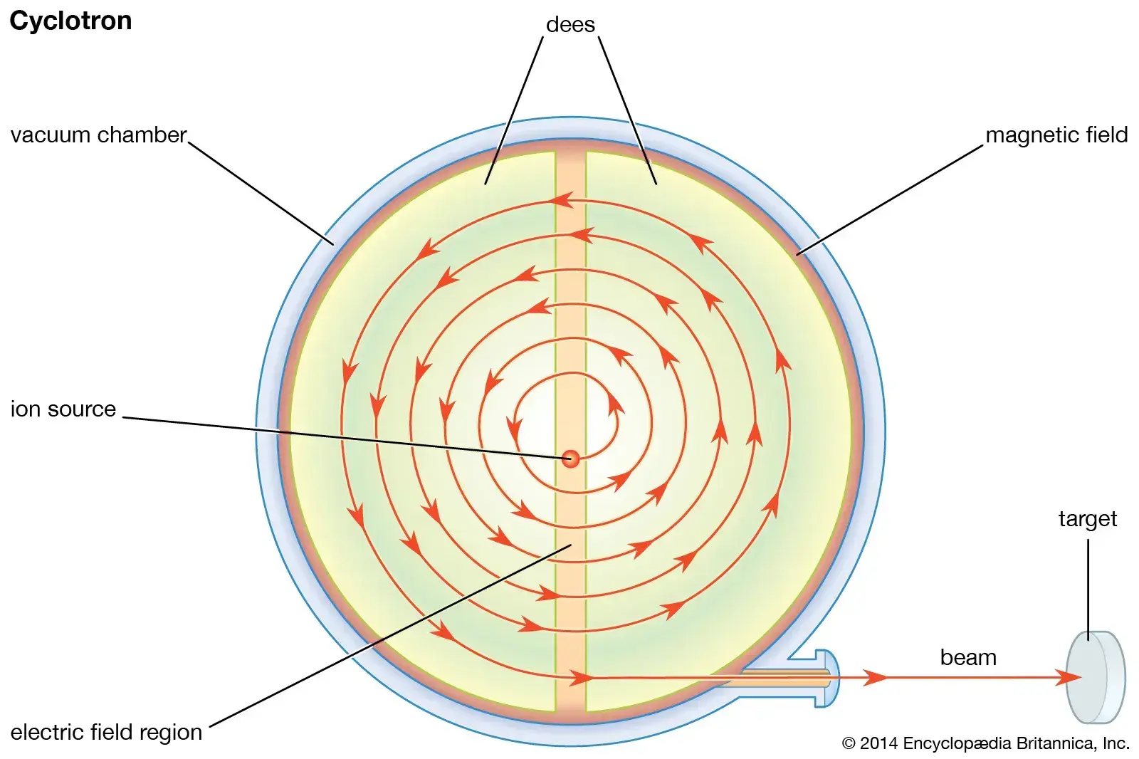 - In a cyclotron, we speed up the proton to a high energy in an accelerator in a magnetic field to pump energy onto an ion and zip it around inside → crash them into a target → either glob it onto or break apart the target to collect our final product out the other side