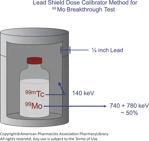 - Use a dose calibrator to test for the molybdenum breakthrough: Put our eluate vial into a moly canister (a gas filled chamber) and detect between Molybdenum and Technetium by detecting the difference between the technetium photon of 140 keV, and the molybdenum, which has a photon abundance of 740 and 780 keV.