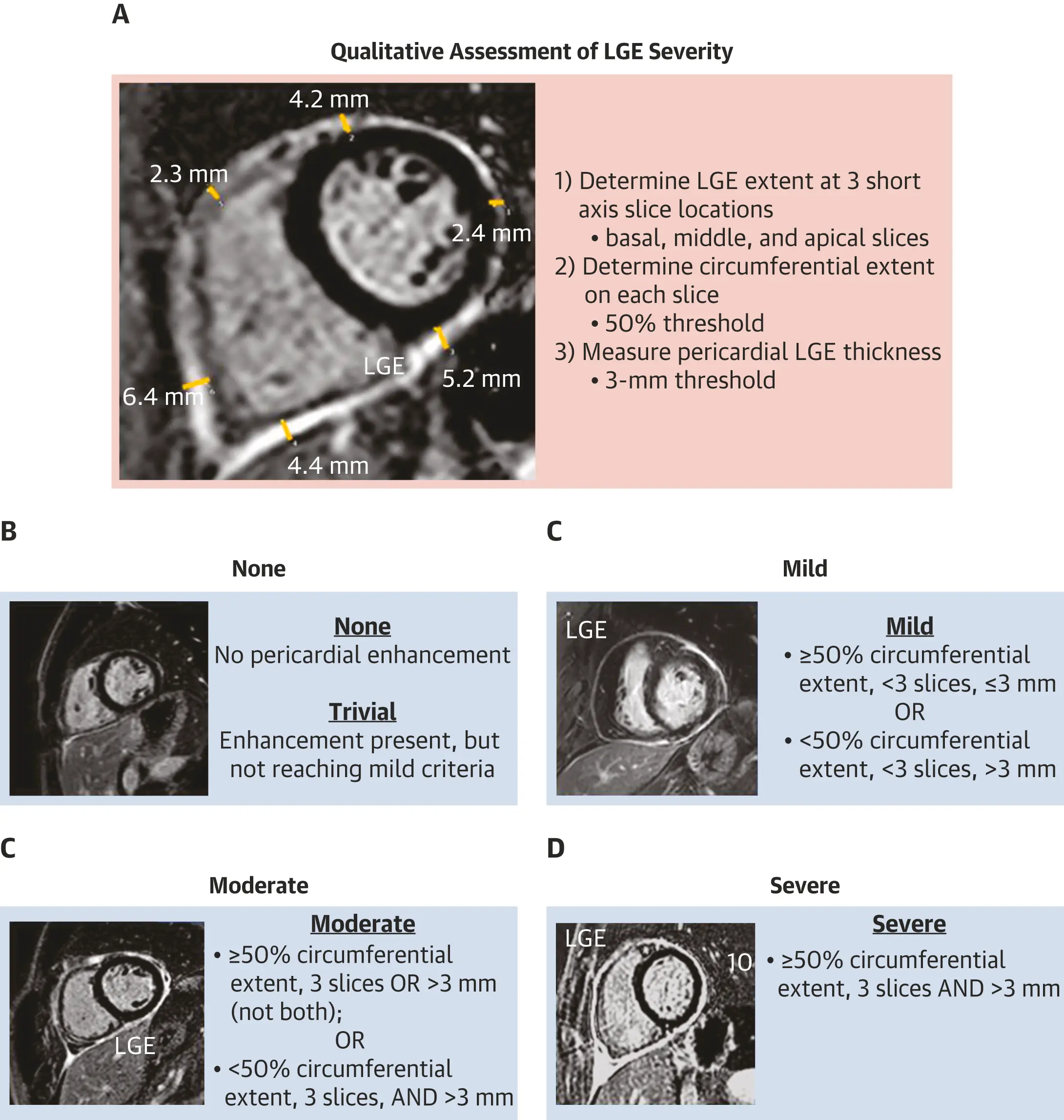 | ▪ Segmental wall motion abnormalities or pathological myocardial strain values (in case of myocarditis) | ▪ Enhancement of the thickened visceral and parietal surfaces of the pericardial sac at late postcontrast CT scan | ▪ Enhancement of pericardium on LGE sequence (inflammation) and T2-STIR sequence (edema) consistent with active inflammation and neovascularization (of prognostic importance) ▪ LGE+/T2-STIR+: acute/subacute phase or recurrent flares ▪ LGE+/T2-STIR-: subacute or chronic phase ▪ LGE-/T2-STIR-: resolution or end-stage/calcific phase |