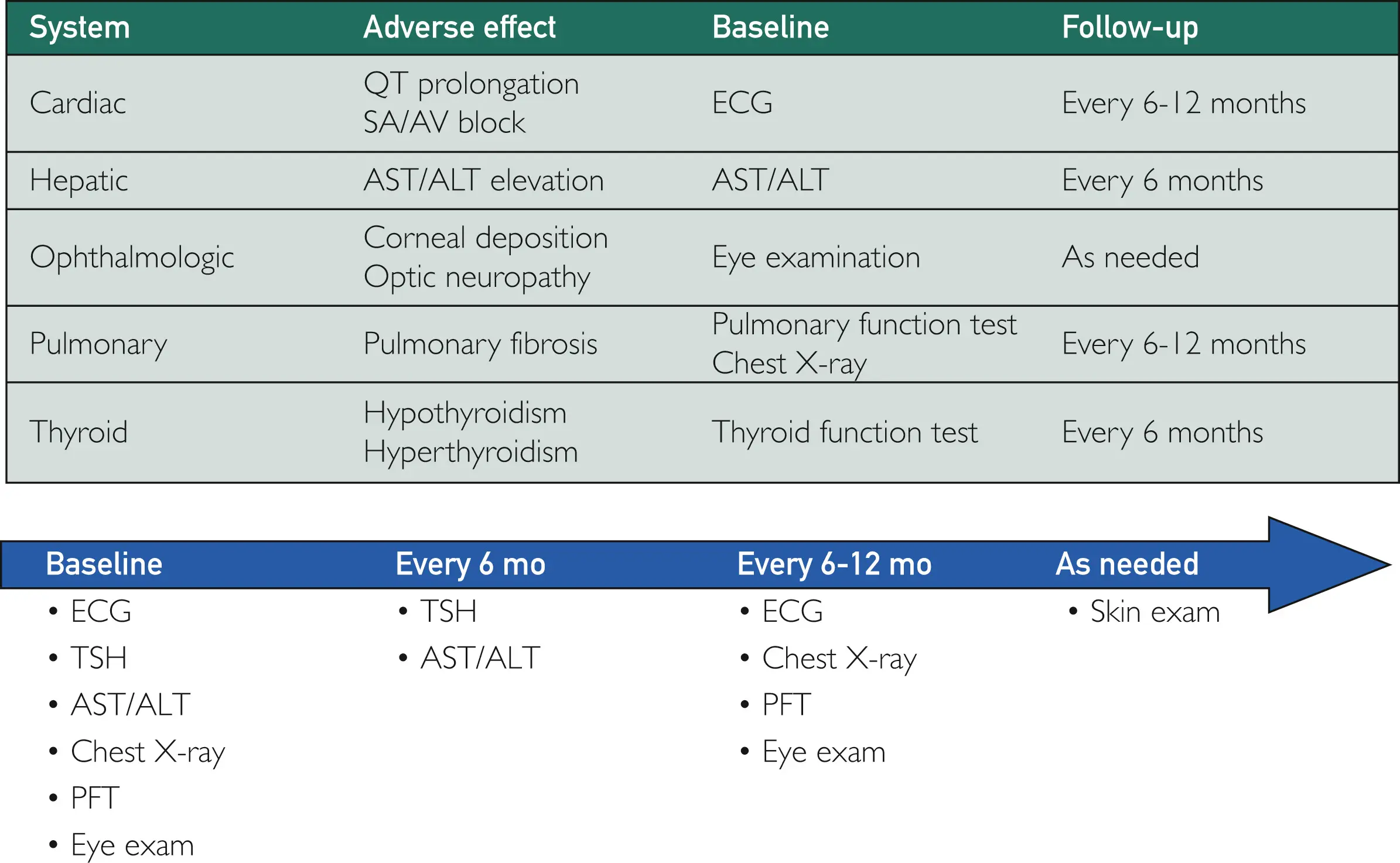 - Long-term amiodarone use can be associated with numerous adverse effects, and thus active surveillance is required. 1