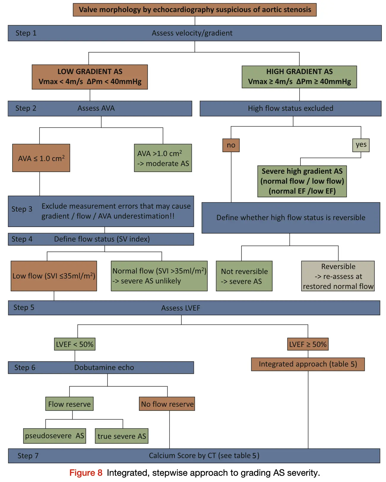 - 4 point out that the above thresholds were defined using AS defined with predominantly concordant AS Echo measurements, which isn’t the case in low-flow, low-gradient (Stage D) AS. In their study, 4 find that CAC scores had poor discrimination between AS severity, so probably worth sticking to DSE for these patients.